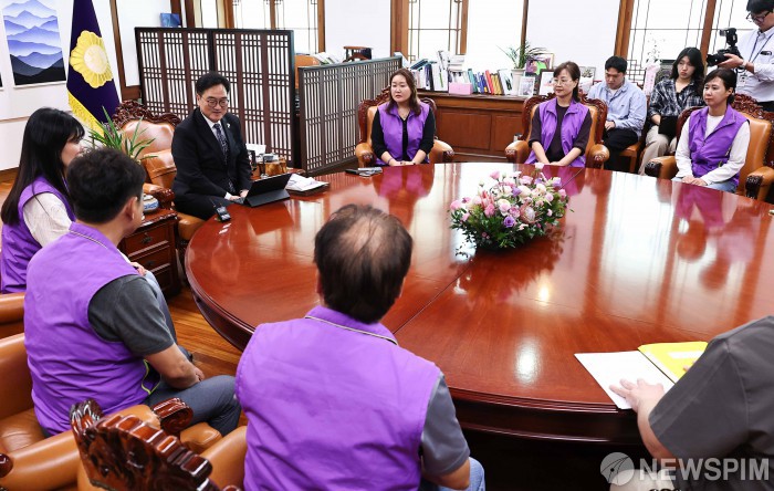[서울=뉴스핌] 윤창빈 기자 = 우원식 국회의장이 15일 오후 서울 여의도 국회에서 10.29 이태원참사 유가족들과 면담을 하고 있다. 2025.10.15 pangbin@newspim.com