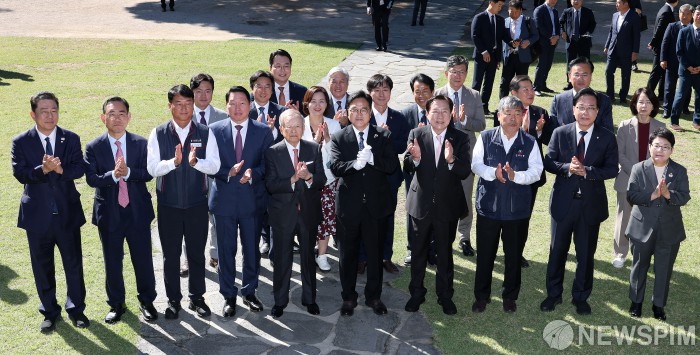 [서울=뉴스핌] 정일구 기자 = 우원식 국회의장과 노사 5단체 대표 등이 15일 오전 서울 여의도 국회 사랑재에서 열린 국회 사회적 대화 공동 선언식에 참석하며 기념촬영을 하고 있다. 2025.10.15 mironj19@newspim.com