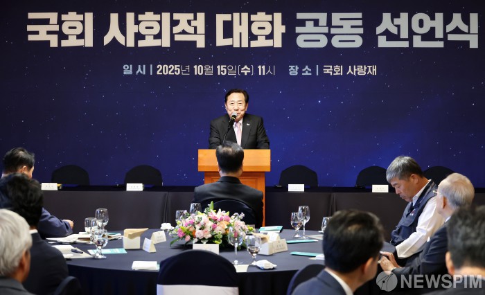 [서울=뉴스핌] 정일구 기자 = 김기문 중소기업중앙회장이 15일 오전 서울 여의도 국회 사랑재에서 열린 국회 사회적 대화 공동 선언식에서 인사말을 하고 있다. 2025.10.15 mironj19@newspim.com
