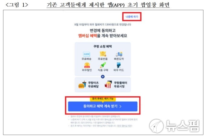 우선 쿠팡은 지난해 4월 자사의 유료 멤버십 서비스인 와우멤버십의 가격을 월 4990원에서 7890원으로 인상하는 과정에서 기존 소비자가 '즉시 동의'를 선택하도록 유인한 혐의로 조사를 받았다.
