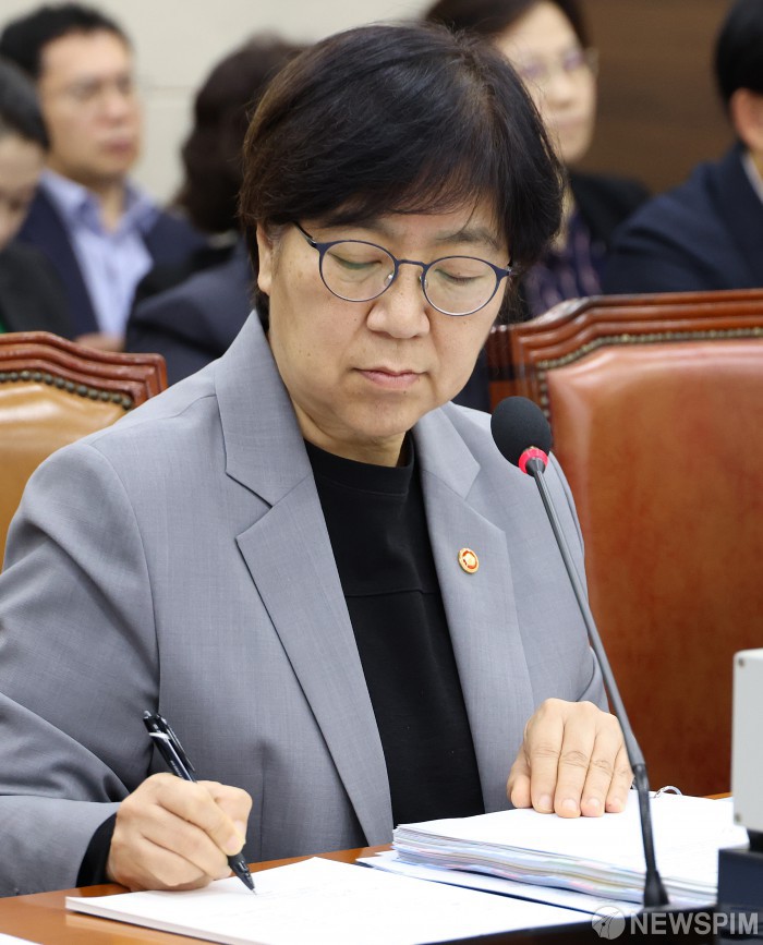 [서울=뉴스핌] 정일구 기자 = 정은경 보건복지부 장관이 15일 서울 여의도 국회 보건복지위원회에서 열린 보건복지부 등에 대한 국정감사에서 메모하고 있다. 2025.10.15 mironj19@newspim.com