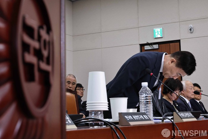[서울=뉴스핌] 윤창빈 기자 = 허성우 한국교육시설안전원 이사장이 16일 오전 서울 여의도 국회에서 열린 교육위원회의 한국고전번역원 등에 대한 국정감사에서 질문사주 의혹과 관련해 사과를 하고 있다. 2025.10.16 pangbin@newspim.com