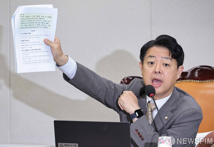 [서울=뉴스핌] 윤창빈 기자 = 김영호 국회 교육위원장이 16일 오전 서울 여의도 국회에서 열린 교육위원회의 한국고전번역원 등에 대한 국정감사에서 한국교육시설안전원의 질문 사주 의혹과 관련해 발언하고 있다. 2025.10.16 pangbin@newspim.com
