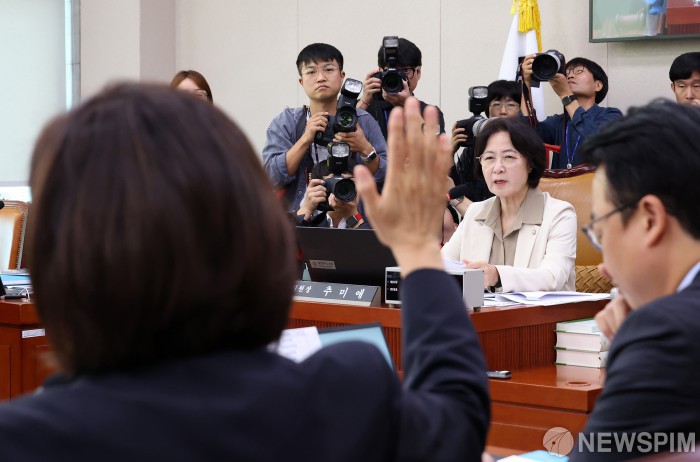 [서울=뉴스핌] 정일구 기자 = 나경원 국민의힘 의원이 16일 오전 서울 여의도 법제사법위원회에서 열린 감사원에 대한 국정감사에서 추미애 위원장에게 의사진행 발언을 요청하고 있다. 2025.10.16 mironj19@newspim.com