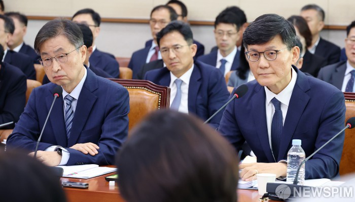 [서울=뉴스핌] 정일구 기자 = 최재해 감사원장과 정상우 사무총장이 16일 오후 서울 여의도 국회 법제사법위원회에서 열린 감사원에 대한 국정감사에 출석해 있다. 2025.10.16 mironj19@newspim.com