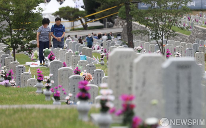[서울=뉴스핌] 황준선 기자 = 현충일을 하루 앞둔 5일 오후 서울 동작구 국립현충원을 찾은 시민들이 참배를 하고 있다. 2022.06.05 hwang@newspim.com |