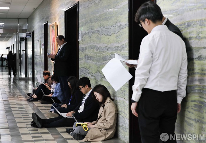 [서울=뉴스핌] 윤창빈 기자 = 16일 오후 서울 여의도 국회에서 열린 과학기술정보방송통신위원회 국정감사가 최민희 위원장이 취재진 퇴장을 선언해 비공개로 진행되자 취재진들이 회의장 밖에 앉아있다. 2025.10.16 pangbin@newspim.com