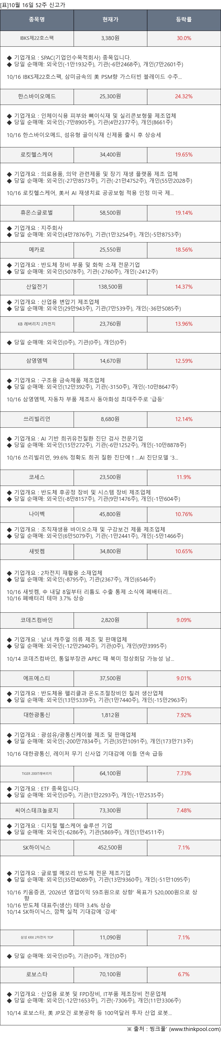 [표]10월 16일 52주 신고가 종목 및 최근 동향