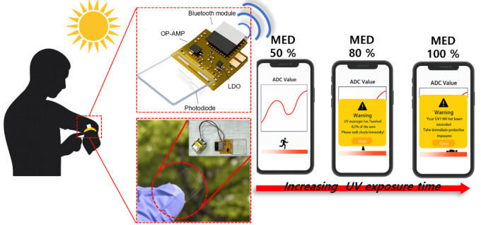 연구팀은 ㈜유비전랩과 공동으로 블루투스 회로, 스마트폰 앱과 연동하는 실시간 자외선 모니터링 해법을 개발했다. 해당 시스템은 햇빛 아래 자외선 강도를 실시간으로 표시하고 사용자의 자외선 노출이 위험 수준에 도달하면 경고한다.