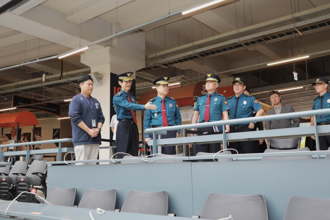 최주원(가운데) 대전경찰청장이 대전 한화생명 볼파크를 찾아 현장점검을 진행했다. [사진=대전경찰청] 2025.10.16 jongwon3454@newspim.com |