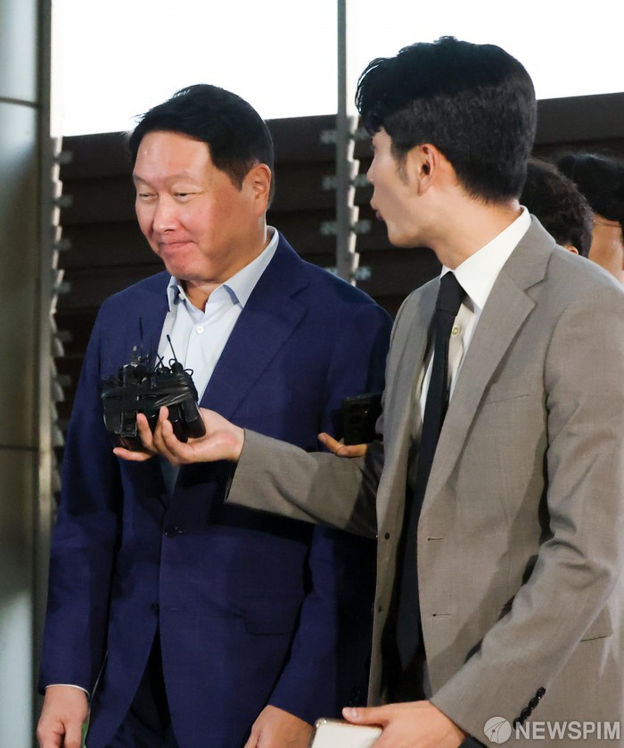 [서울=뉴스핌] 최지환 기자 = 최태원 SK그룹 회장이 16일 오후 미국 출국을 위해 서울 강서구 서울김포비즈니스항공센터로 들어가고 있다. 최태원 SK그룹 회장을 비롯해 이재용 삼성전자 회장, 정의선 현대차그룹 회장, 구광모 LG그룹 회장 등 주요 기업 총수들이 손정의 소프트뱅크 회장의 초청으로 미국 마러라고리조트에서 개최되는 AI 인프라 구축 프로젝트 '스타게이트' 관련 투자 행사에 참석할 예정이다. 2025.10.16 choipix16@newspim.com
