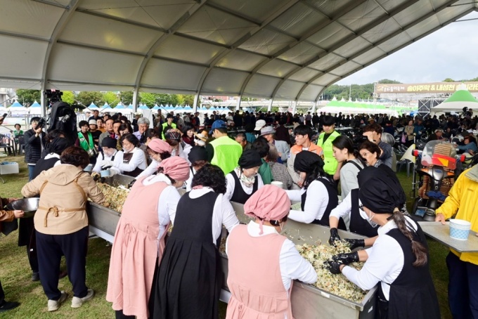 송이·한약우·농산물‧문화 한자리에...'오색오미 대형 비빔밥' 퍼포먼스 '장관'