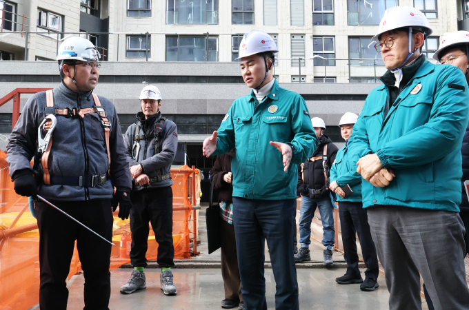 오언석 도봉구청장(가운데)이 지역 대형공사장을 찾아 현장 관계자에게 근로자 안전관리 준수 등을 강조하고 있다. [사진=도봉구] |