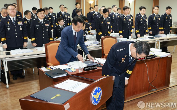 [서울=뉴스핌] 김학선 기자 = 유재성 경찰청장 직무대행이 17일 서울 서대문구 경찰청에서 열린 2025 행정안전위원회 국정감사에서 인사하고 있다. 2025.10.17 yooksa@newspim.com