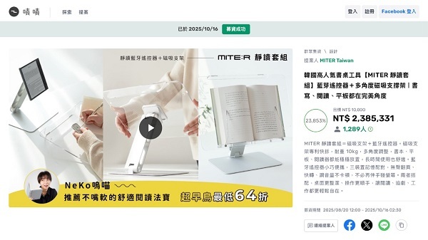 [서울=뉴스핌] 오경진 기자 = 주식회사 미테르의 '미테르 마그네틱 독서대'가 대만 최대 크라우드펀딩 플랫폼 젝젝(ZecZec)에서 NT$ 2,385,331(한화 약 1억 1천만 원)을 모금하며 목표 대비 23,853%를 초과 달성해 프로젝트를 성공적으로 마무리했다고 밝혔다. 이번 프로젝트는 젝젝의 국내 유일 독점 파트너인 세토웍스가 총괄했다.