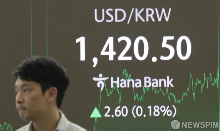 [서울=뉴스핌] 양윤모 기자 = 17일 오후 코스피가 전장 종가보다 0.52 포인트(0.01%) 상승하며 3748.89로, 코스닥은 5.87 포인트(0.68%) 하락한 859.54로 장을 마감한 가운데, 서울 중구 하나은행 딜링룸에서 직원들이 업무를 보고 있다. 서울외환시장에서 달러/원 환율은 전장 대비 2.60원 상승한 1420.50원에 거래를 마감했다. 2025.10.17 yym58@newspim.com