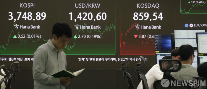 [서울=뉴스핌] 양윤모 기자 = 17일 오후 코스피가 전장 종가보다 0.52 포인트(0.01%) 상승하며 3748.89로, 코스닥은 5.87 포인트(0.68%) 하락한 859.54로 장을 마감한 가운데, 서울 중구 하나은행 딜링룸에서 직원들이 업무를 보고 있다. 서울외환시장에서 달러/원 환율은 전장 대비 2.70원 상승한 1420.60원에 거래를 마감했다. 2025.10.17 yym58@newspim.com