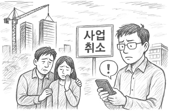 운정중앙역 주복 사전청약자에게 사업취소를 문자로 통보해 허탈해 하고 있는 모습. [이미지=AI생성] 2025.10.18 atbodo@newspim.com