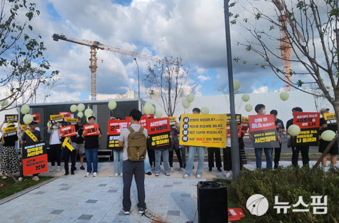 비대위가 주복 부지 현장에서 지위보장 등을 요구하며 집회를 열고 있는 모습. [사진=최환금 기자] atbodo@newspim.com