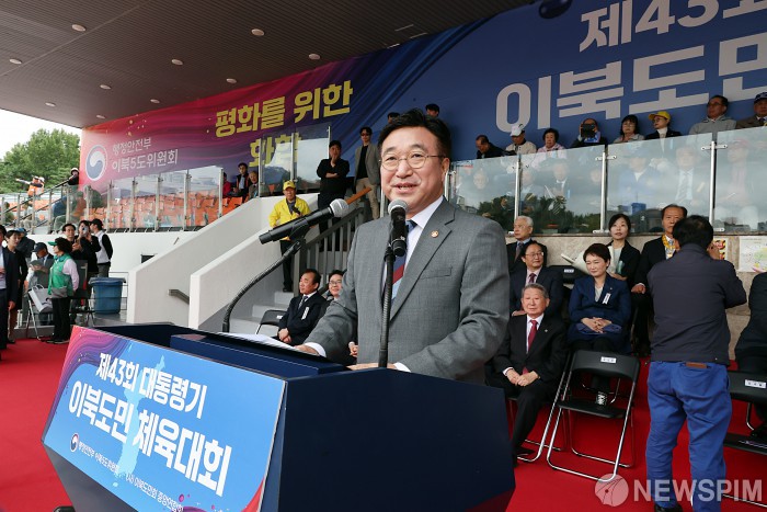 [서울=뉴스핌] 윤호중 행정안전부 장관이 19일 오전 서울 용산구 효창운동장에서 열린 제43회 대통령기 이북도민 체육대회에서 축사하고 있다. [사진=행정안전부] 2025.10.19 photo@newspim.com