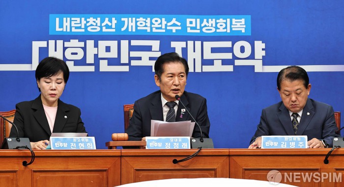 [서울=뉴스핌] 윤창빈 기자 = 정청래 더불어민주당 대표가 20일 오전 서울 여의도 국회에서 열린 최고위원회의에서 모두발언을 하고 있다. 2025.10.20 pangbin@newspim.com