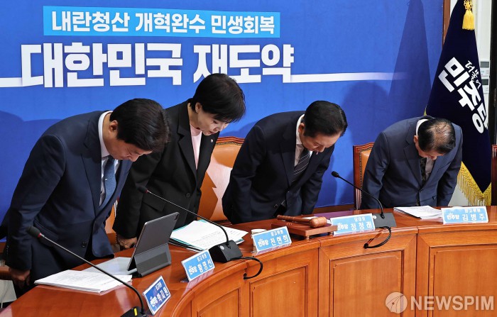 [서울=뉴스핌] 윤창빈 기자 = 정청래 더불어민주당 대표 등 당직자들이 20일 오전 서울 여의도 국회에서 열린 최고위원회의에서 인사를 하고 있다. 2025.10.20 pangbin@newspim.com