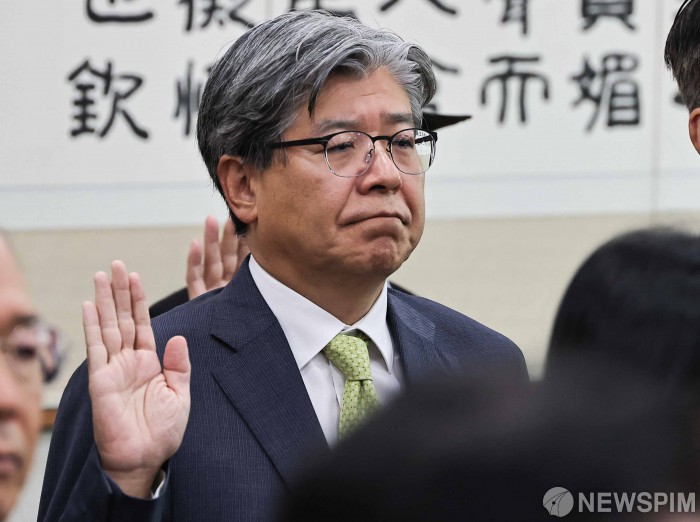 [서울=뉴스핌] 윤창빈 기자 = 나경원 국민의힘 배우자인 김재호 춘천지방법원장이 20일 오전 서울 여의도 국회에서 법제사법위원회의 서울고등법원 등에 대한 국정감사에서 선서를 하고 있다. 2025.10.20 pangbin@newspim.com