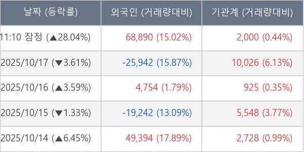 [서울=뉴스핌] 로보뉴스 = 20일 11시 30분 현재 아이티켐(309710)은 전일 대비 28.04% (현재가 42,700원) 상승했고, 기관이 최근 6일 연속 순매수(누적 39,742주, 잠정) 행진을 하고 있다.