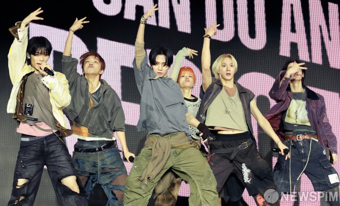 [서울=뉴스핌] 김학선 기자 = 그룹 보이넥스트도어(성호, 리우, 명재현, 태산, 이한, 운학)가 20일 서울 강서구 KBS아레나에서 열린 미니 5집 'The Action' 쇼케이스에서 타이틀곡 '할리우드 액션'을 선보이고 있다. 타이틀곡 '할리우드 액션'은 할리우드 스타 같은 자신감이 느껴지는 노래다. 2025.10.20 yooksa@newspim.com