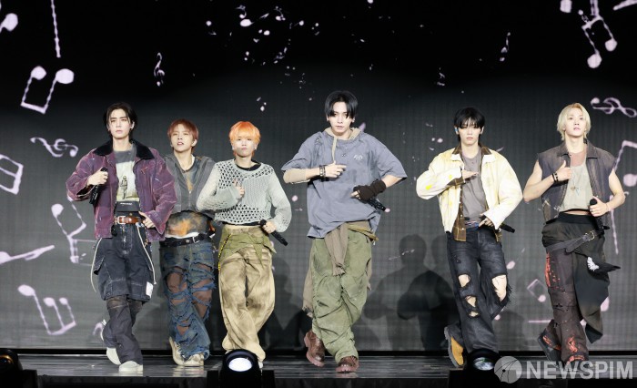 [서울=뉴스핌] 김학선 기자 = 그룹 보이넥스트도어(성호, 리우, 명재현, 태산, 이한, 운학)가 20일 서울 강서구 KBS아레나에서 열린 미니 5집 ‘The Action’ 쇼케이스에서 타이틀곡 '할리우드 액션'을 선보이고 있다. 타이틀곡 ‘할리우드 액션’은 할리우드 스타 같은 자신감이 느껴지는 노래다. 2025.10.20 yooksa@newspim.com