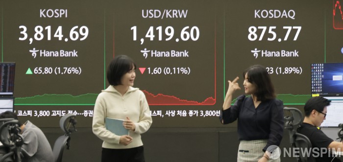 [서울=뉴스핌] 양윤모 기자 = 미중 무역 갈등 완화 기대감에 20일 오후 코스피가 전장 종가보다 65.80 포인트(1.76%) 상승하며 3814.69로, 코스닥은 16.23 포인트(1.89%) 상승한 875.77로 장을 마감한 가운데, 서울 중구 하나은행 딜링룸에서 직원들이 업무를 보고 있다. 서울외환시장에서 달러/원 환율은 전장 대비 1.60원 하락한 1419.60원에 거래를 마감했다. 2025.10.20 yym58@newspim.com