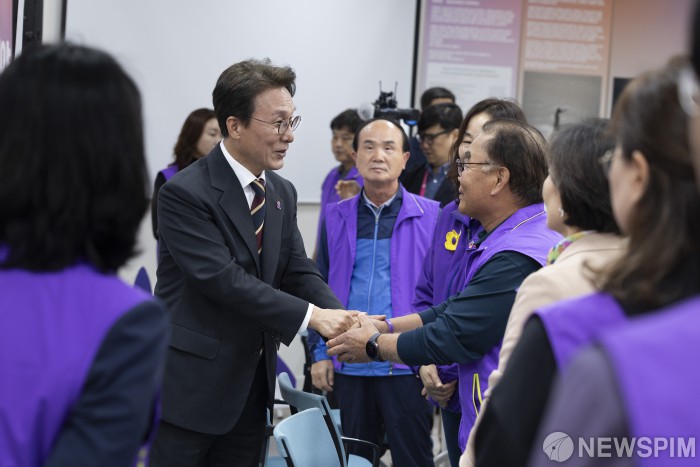 [서울=뉴스핌] 청사사진기자단 =김민석 국무총리가 20일 오후 이태원 참사 3주기를 앞두고 서울 종로구 적선현대빌딩에 있는 ‘별들의 집’을 방문해 10·29 이태원 참사 유가족협의회 회원들과 악수를 나누고 있다.2025.10.20 photo@newspim.com