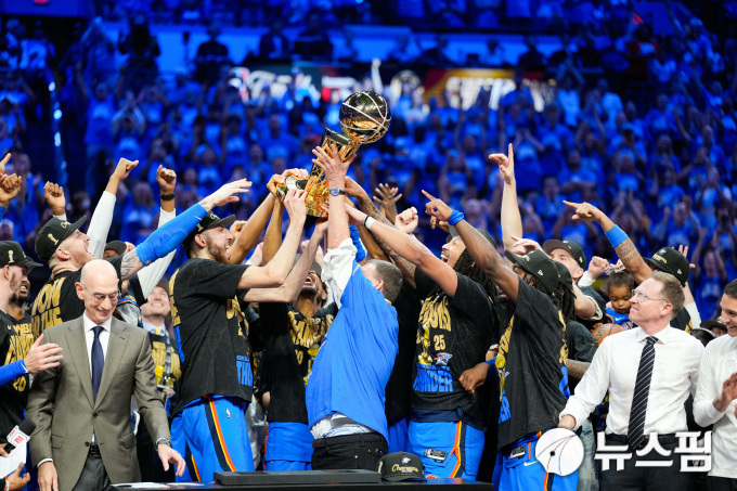 [오클라호마시티 로이터=뉴스핌] 장환수 스포츠전문기자= 오클라호마시티 선수단이 지난 6월에 열린 인디애나와 파이널 7차전 홈경기에서 승리한 뒤 래리 오브라이언 트로피를 들어 올리며 기뻐하고 있다. 2025.06.23 zangpabo@newspim.com |