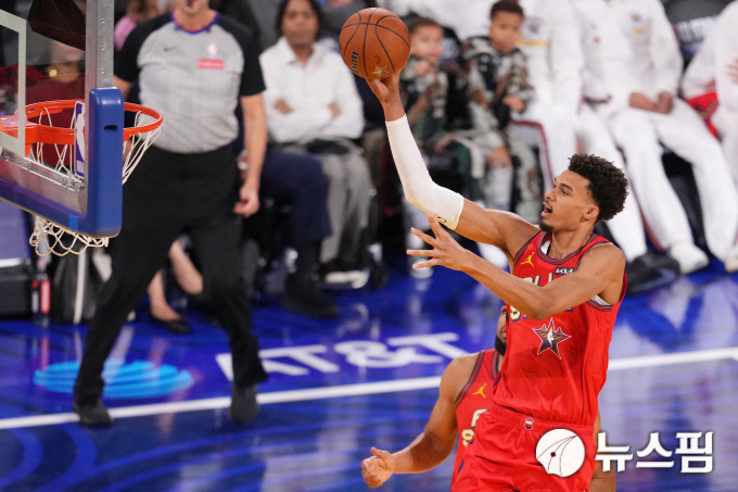 [샌프란시스코 로이터=뉴스핌] 장환수 스포츠전문기자= 빅토르 웸반야마가 지난 2월 17일 올스타전에서 레이업슛을 하고 있다. 2025.02.21 zangpabo@newspim.com |
