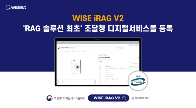 [서울=뉴스핌] 이나영 기자= 인공지능(AI) 에이전트 전문기업 와이즈넛은 국내 최초 RAG 솔루션 'WISE iRAG V2(와이즈 아이랙)'가 조달청 디지털서비스몰에 RAG 솔루션 최초로 등록되었다고 21일 밝혔다.