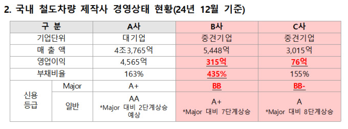 또 다른 철도차량 업체 B사는 매출 5448억원, 영업이익 315억원, 부채비율이 무려 435%에 달했지만 메이저 평가사에서는 'BB', 일반 평가사에서는 'A+' 등급을 받아 무려 7단계가 상승했다.