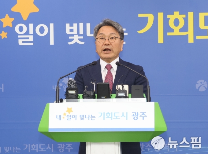 [광주=뉴스핌] 박진형 기자 = 강기정 광주시장이 21일 오전 청사 브리핑실에서 국가AI컴퓨팅센터 유치 관련 긴급 기자회견을 하고 있다. 2025.10.21bless4ya@newspim.com
