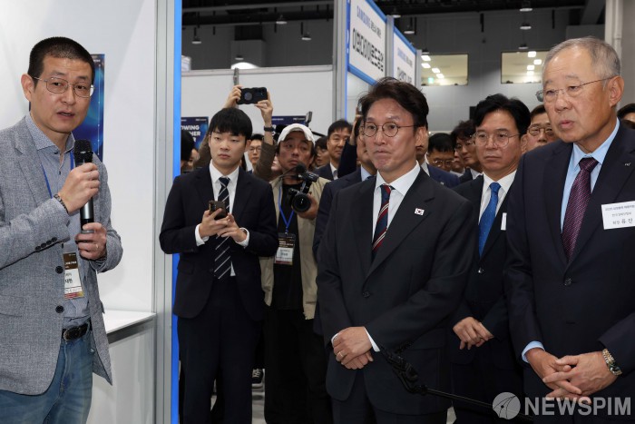[서울=뉴스핌] 청사사진기자단 =김민석 국무총리가 21일 서울 강서구 코엑스 마곡에서 열린 2025 민관합동 상생협력 채용박람회에 참석, 부스를 돌아보고 있다. 오른쪽 류진 한국경제인협회장.2025.10.21 photo@newspim.com