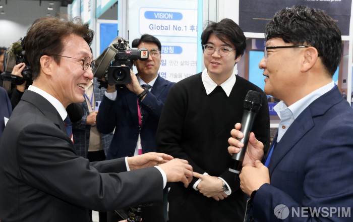 [서울=뉴스핌] 최지환 기자 = 김민석 국무총리가 21일 오전 서울 강서구 코엑스 마곡에서 열린 민관합동 상생협력 채용박람회에서 구직자 및 채용담당자와 대화를 나누고 있다. 2025.10.21 choipix16@newspim.com