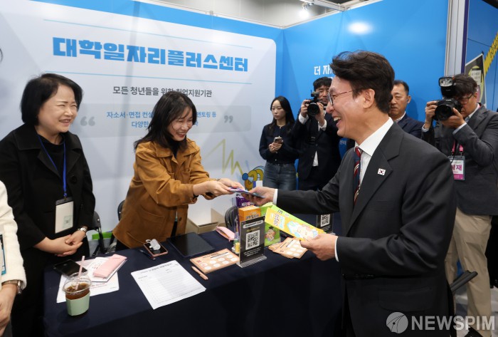 [서울=뉴스핌] 최지환 기자 = 김민석 국무총리가 21일 오전 서울 강서구 코엑스 마곡에서 열린 민관합동 상생협력 채용박람회에서 대학일자리플러스센터 부스를 둘러보고 있다. 2025.10.21 choipix16@newspim.com