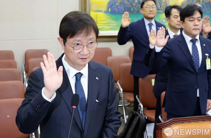 [서울=뉴스핌] 정일구 기자 = 이찬진 금융감독원장이 21일 오전 서울 여의도 국회 정무위원회에서 열린 금융감독원 등에 대한 국정감사에서 증인선서를 하고 있다. 2025.10.21 mironj19@newspim.com