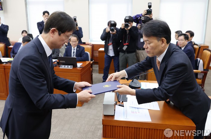 [서울=뉴스핌] 정일구 기자 = 이찬진 금융감독원장이 21일 오전 서울 여의도 국회 정무위원회에서 열린 금융감독원 등에 대한 국정감사에서 윤한홍 위원장에게 증인선서문을 전달하고 있다. 2025.10.21 mironj19@newspim.com