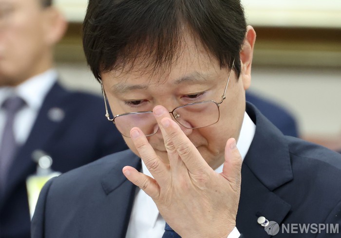 [서울=뉴스핌] 정일구 기자 = 이찬진 금융감독원장이 21일 오전 서울 여의도 국회 정무위원회에서 열린 금융감독원 등에 대한 국정감사에서 안경을 고쳐쓰고 있다. 2025.10.21 mironj19@newspim.com
