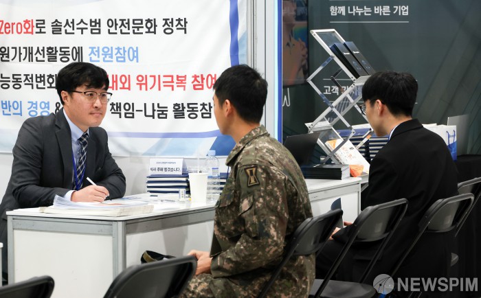 [서울=뉴스핌] 최지환 기자 = 21일 서울 강서구 코엑스 마곡에서 열린 민관합동 상생협력 채용박람회에서 구직자들이 취업상담을 받고 있다. 2025.10.21 choipix16@newspim.com