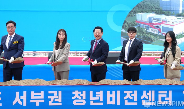 [무안=뉴스핌] 조은정 기자 = 김영록 전남도지사가 21일 무안 오룡리에서 열린 '전라남도 서부권 청년비전센터 기공식'에 참석해 주요내빈들과 기공을 축하하는 시삽 퍼포먼스를 하고 있다. [사진=전남도] 2025.10.21 ej7648@newspim.com