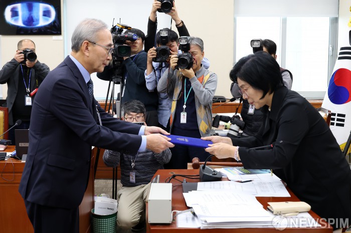 [서울=뉴스핌] 정일구 기자 = 김영섭 KT 대표가 21일 오후 서울 여의도 국회 과학기술정보방송통신위원에서 열린 정보통신산업진흥원 등에 대한 국정감사에서 최민희 위원장에게 증인선서를 전달하고 있다. 2025.10.21 mironj19@newspim.com