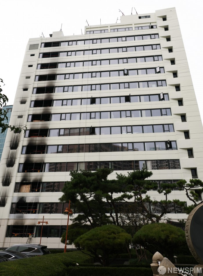 [서울=뉴스핌] 최지환 기자 = 21일 오후 서울 중구 서울광장 인근 서울센터빌딩이 이날 오전 발생한 화재로 그을려 있다. 2025.10.21 choipix16@newspim.com