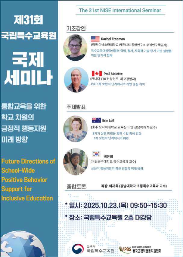 한국긍정적행동지원협회와 공동으로 개최되는 이번 세미나는 전국의 교원와 교육 전문직, 학부모 등 250여 명이 참석할 예정이다. 국립특수교육원 대강당에서 개최되며 '제5회 아시아·태평양 긍정적행동지원 국제학술대회'와 연계해 운영된다.
