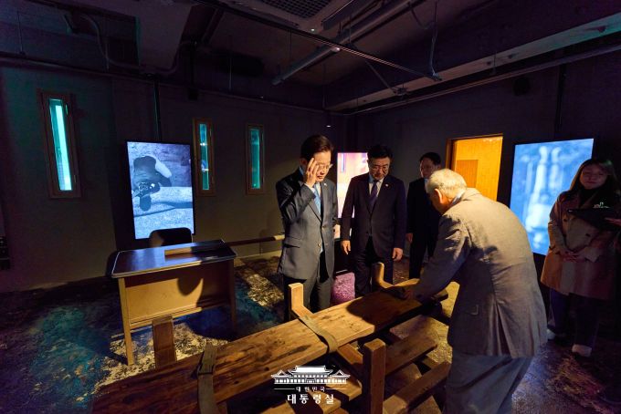 이재명 대통령이 21일 경찰의 날 80주년 기념식 이후 민주화운동 기념관으로 재탄생한 남영동 대공분실을 이재오 민주화운동기념사업회 이사장과 함께 둘러보고 있다. [사진=대통령실] |