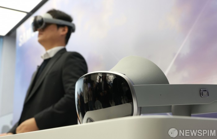 [서울=뉴스핌] 김학선 기자 = 삼성전자가 22일 오전 서울 서초구 삼성 강남에서 구글과 공동 개발한 확장현실(XR) 헤드셋 '갤럭시 XR' 미디어 공개행사를 열었다. 행사장에 '갤럭시 XR'이 전시되어 있다. 2025.10.22 yooksa@newspim.com